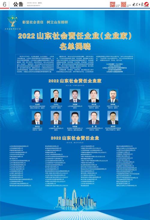 “2022山東社會責任企業(yè)(企業(yè)家)”推選活動,經資料賦分、網絡投票、初審投票、專家終審、媒體公示等程序,全省共有81家企業(yè)獲選“2022山東社會責任企業(yè)”,10名企業(yè)家上榜“2022山東社會責任企業(yè)家”。